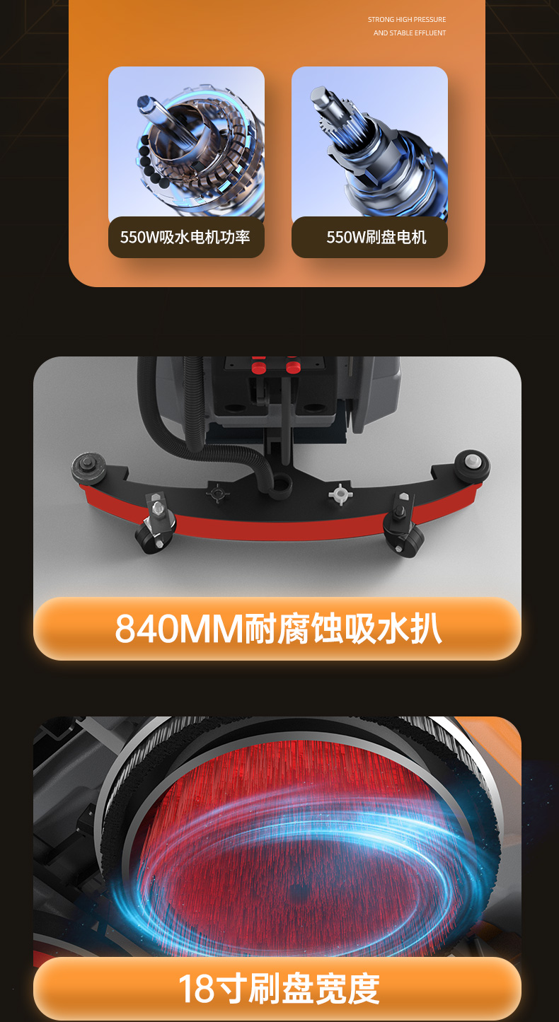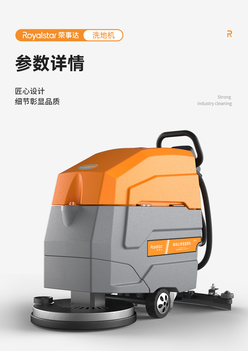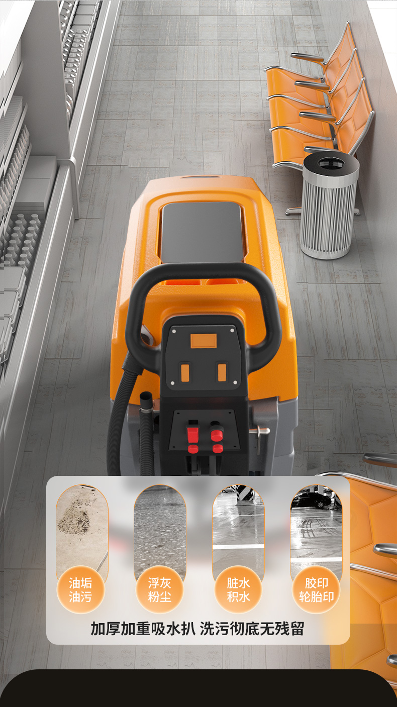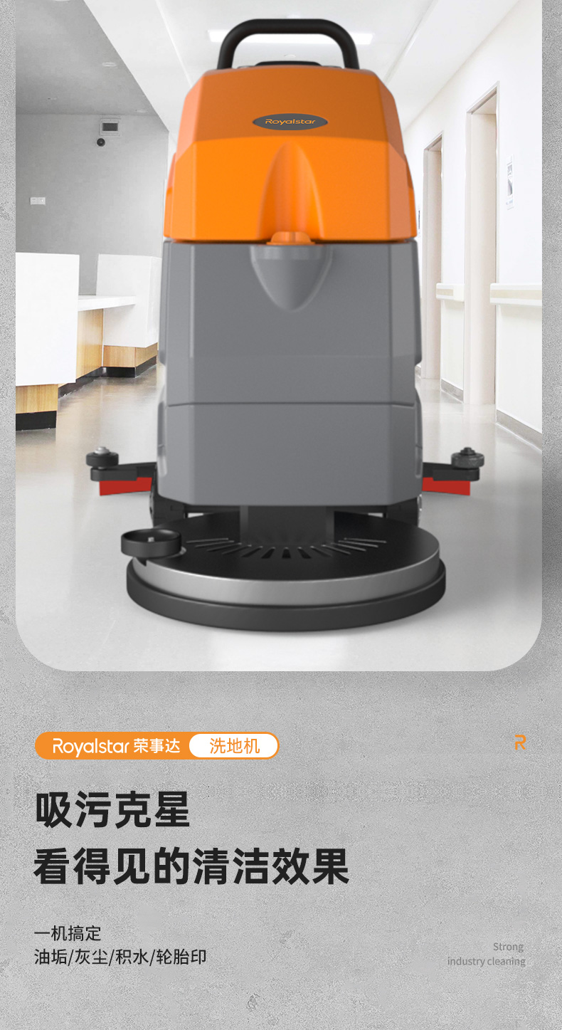 榮事達RS-M65手推式洗地機配備加厚加重吸水扒,吸污更加徹底,避免清潔過程中出現污水殘留。一機就能搞定地面油污、灰塵、積水問題。