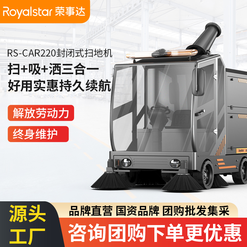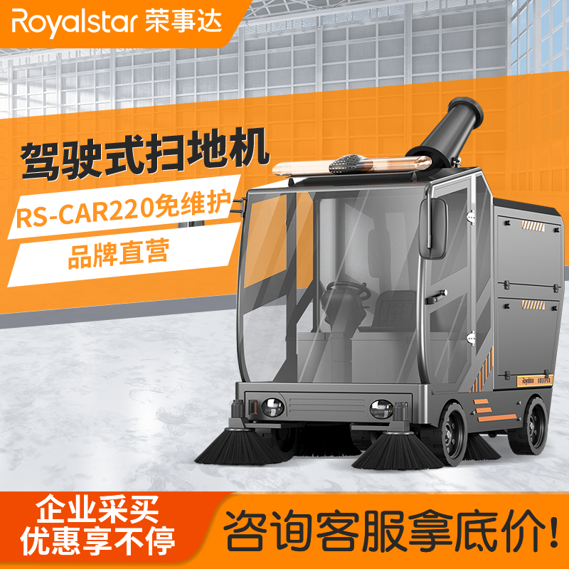 榮事達RS-CAR220 駕駛式掃地機1小時清潔15000平方米,實現了掃地+吸塵+霧炮三合一的功能。靈活霧炮設計,...